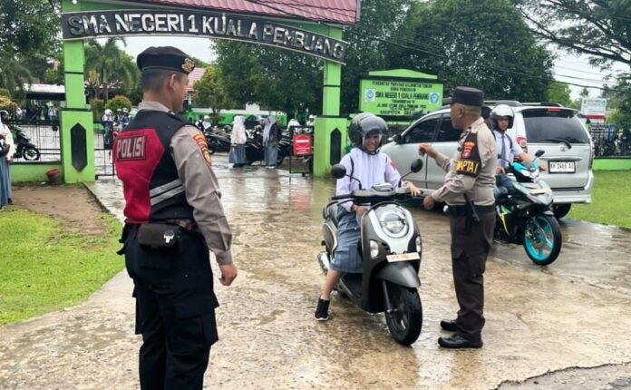 Di Tengah Gerimis, Pamapta Polres Seruyan Sigap Atur Lalin di Depan SMAN 1 Kuala Pembuang
