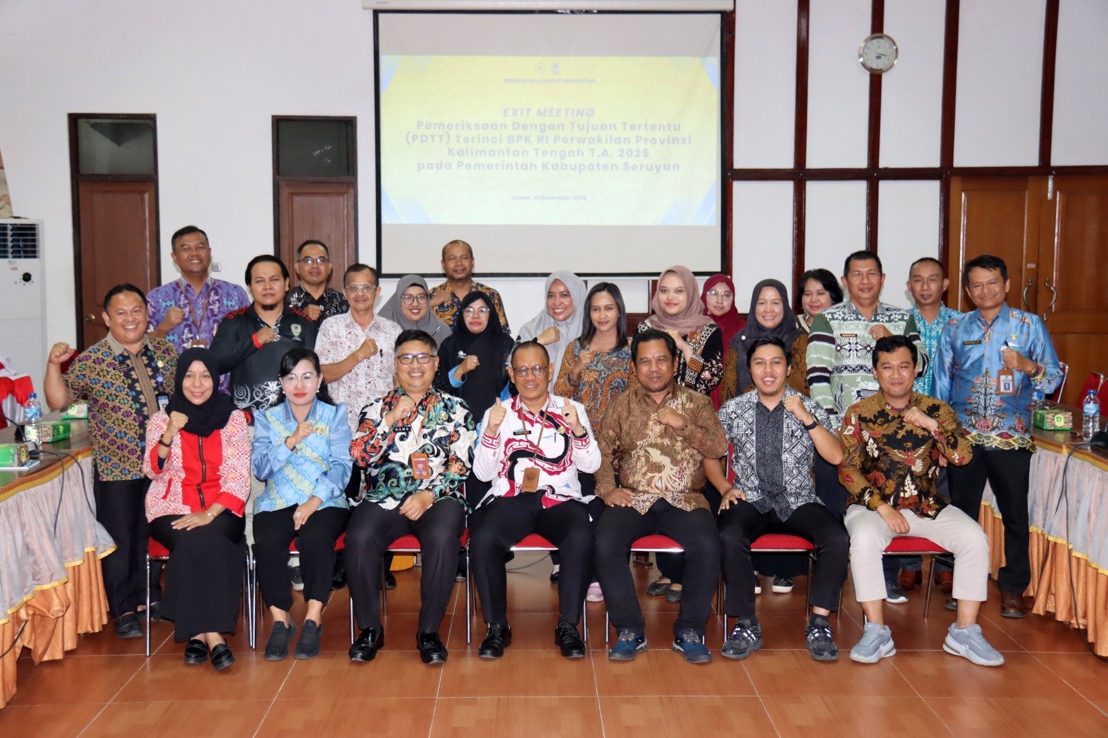 Kuala Pembuang, Zona Kalimantan – Pemerintah Kabupaten Seruyan menggelar kegiatan Exit Meeting Pemeriksaan Dengan Tujuan Tertentu (PDTT) Tahun Anggaran 2025 bersama Badan Pemeriksa Keuangan (BPK) RI Perwakilan Provinsi Kalimantan Tengah. Pertemuan tersebut dipimpin oleh Pj. Sekretaris Daerah Kabupaten Seruyan, dr. Bahrun Abbas, M.P.H., dan berlangsung di Aula Kantor Bupati Seruyan pada Jum’at (12/12/2025).